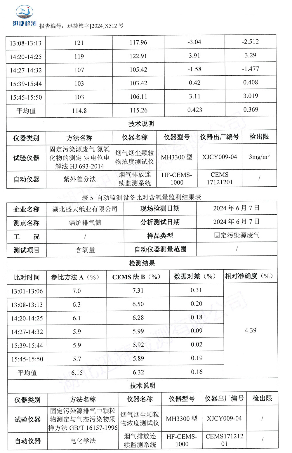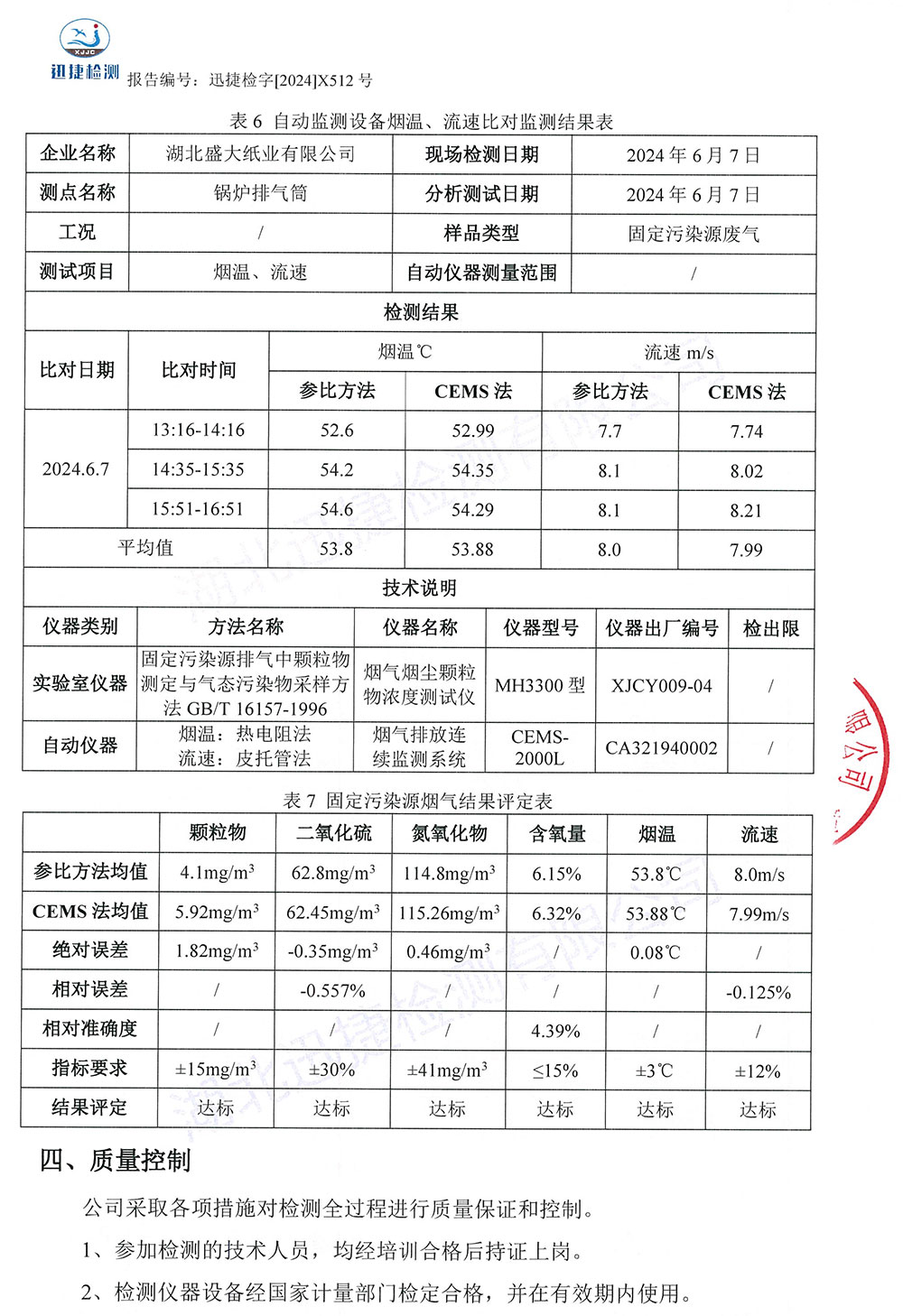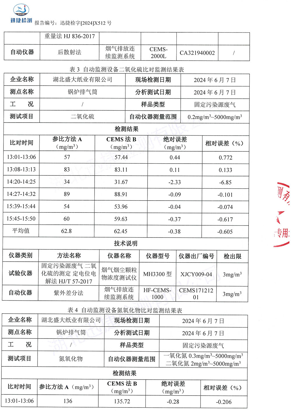 X512 湖北盛大紙業有限公司2024.6月煙氣自動監測系統比對監測報告