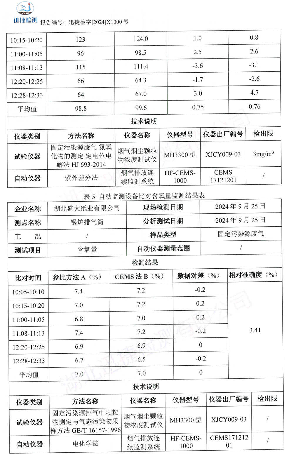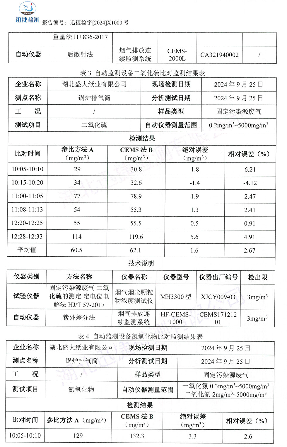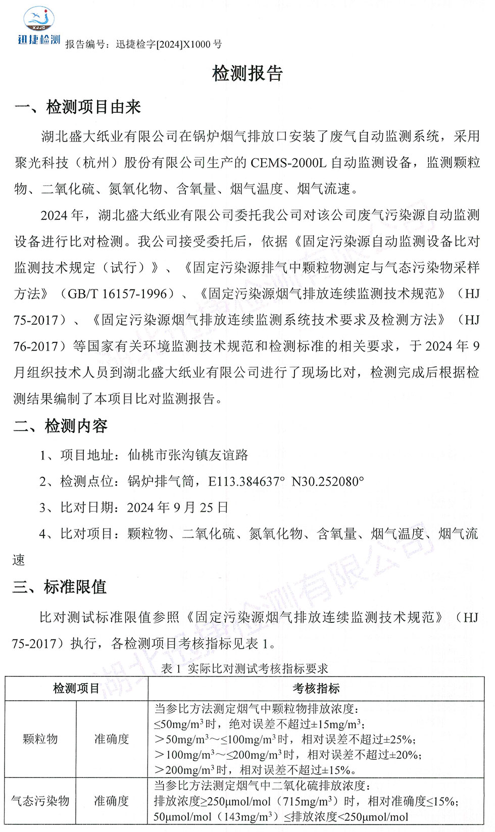 X1000 湖北盛大紙業有限公司煙氣自動監測系統比對監測報告
