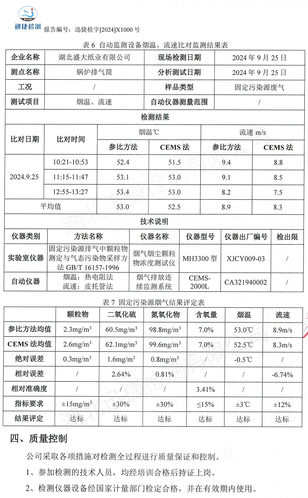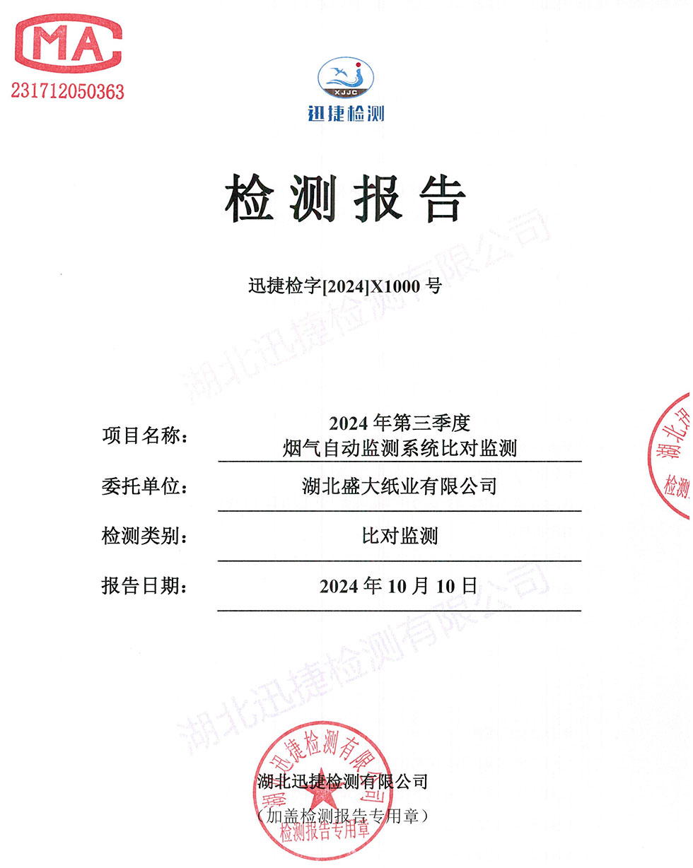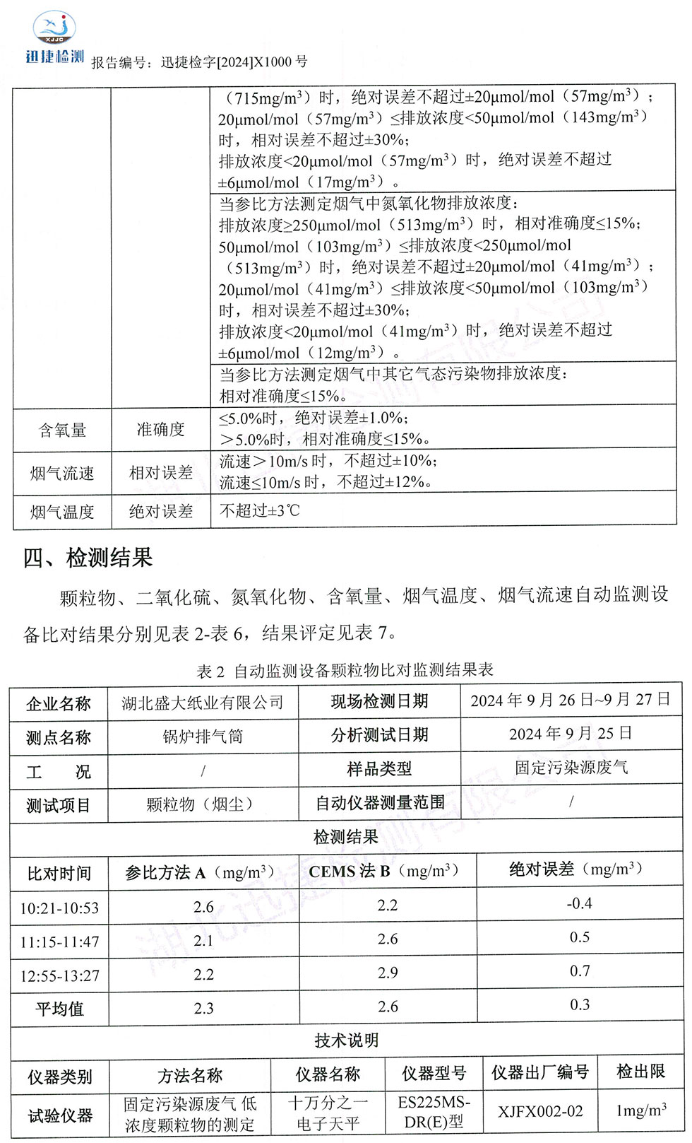 X1000 湖北盛大紙業有限公司煙氣自動監測系統比對監測報告