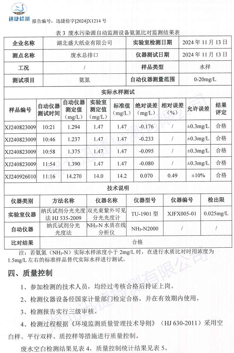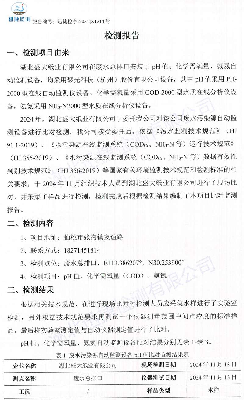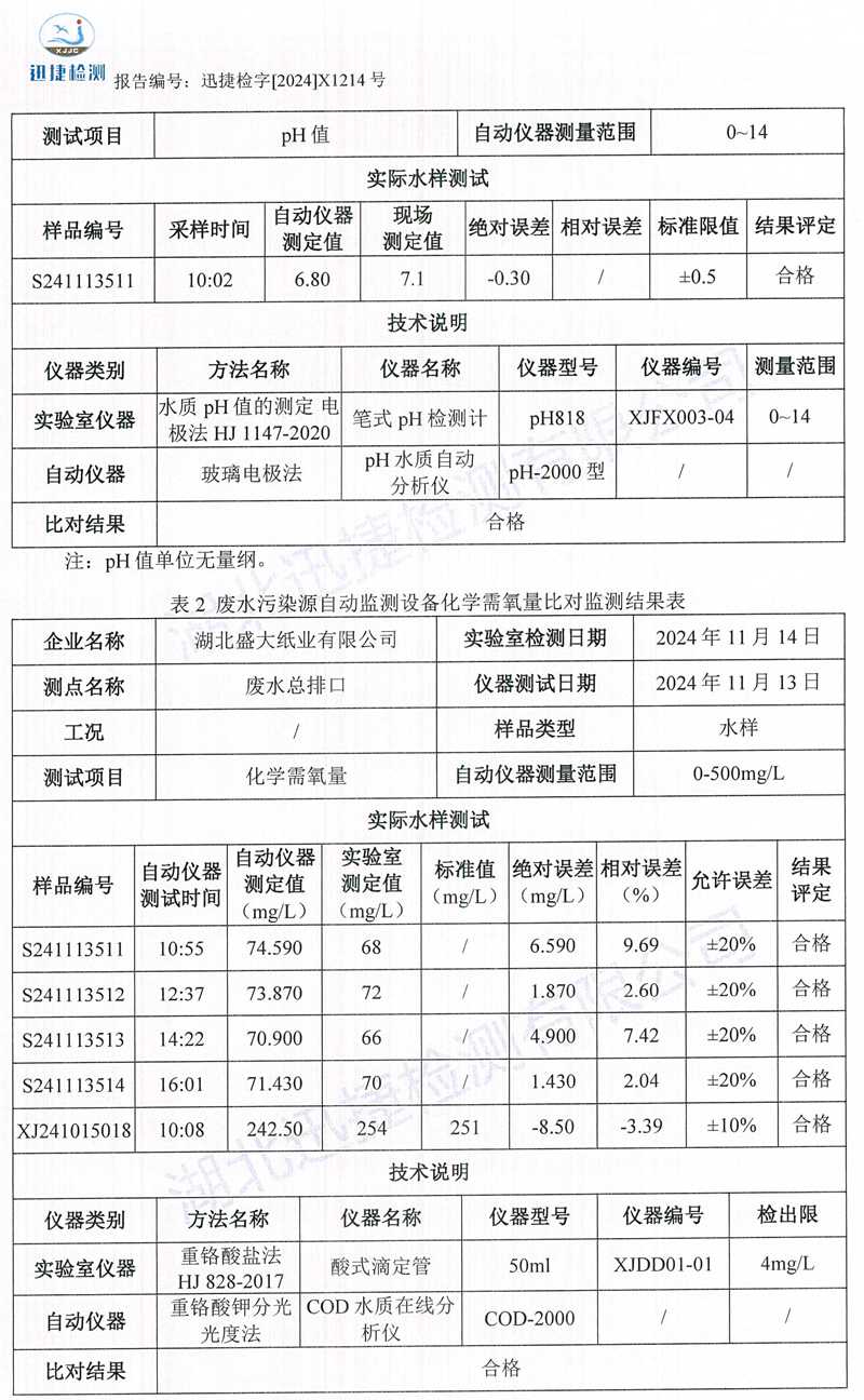 X1214湖北盛大紙業(yè)有限公司2024.11月廢水比對