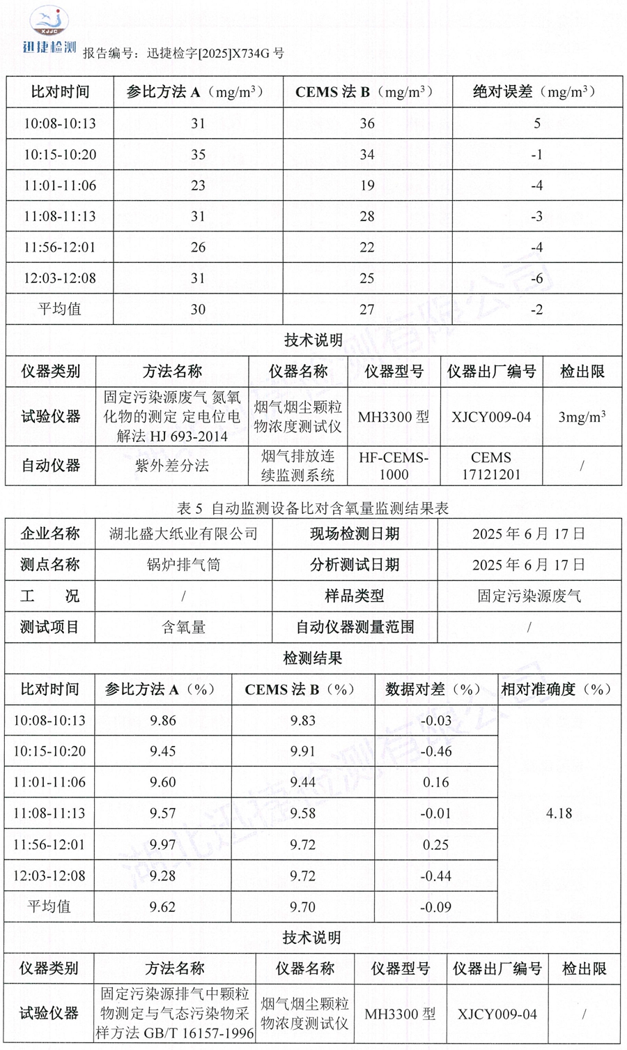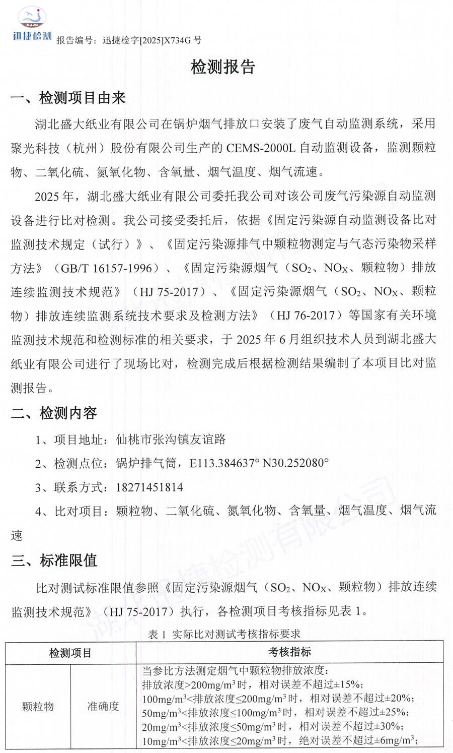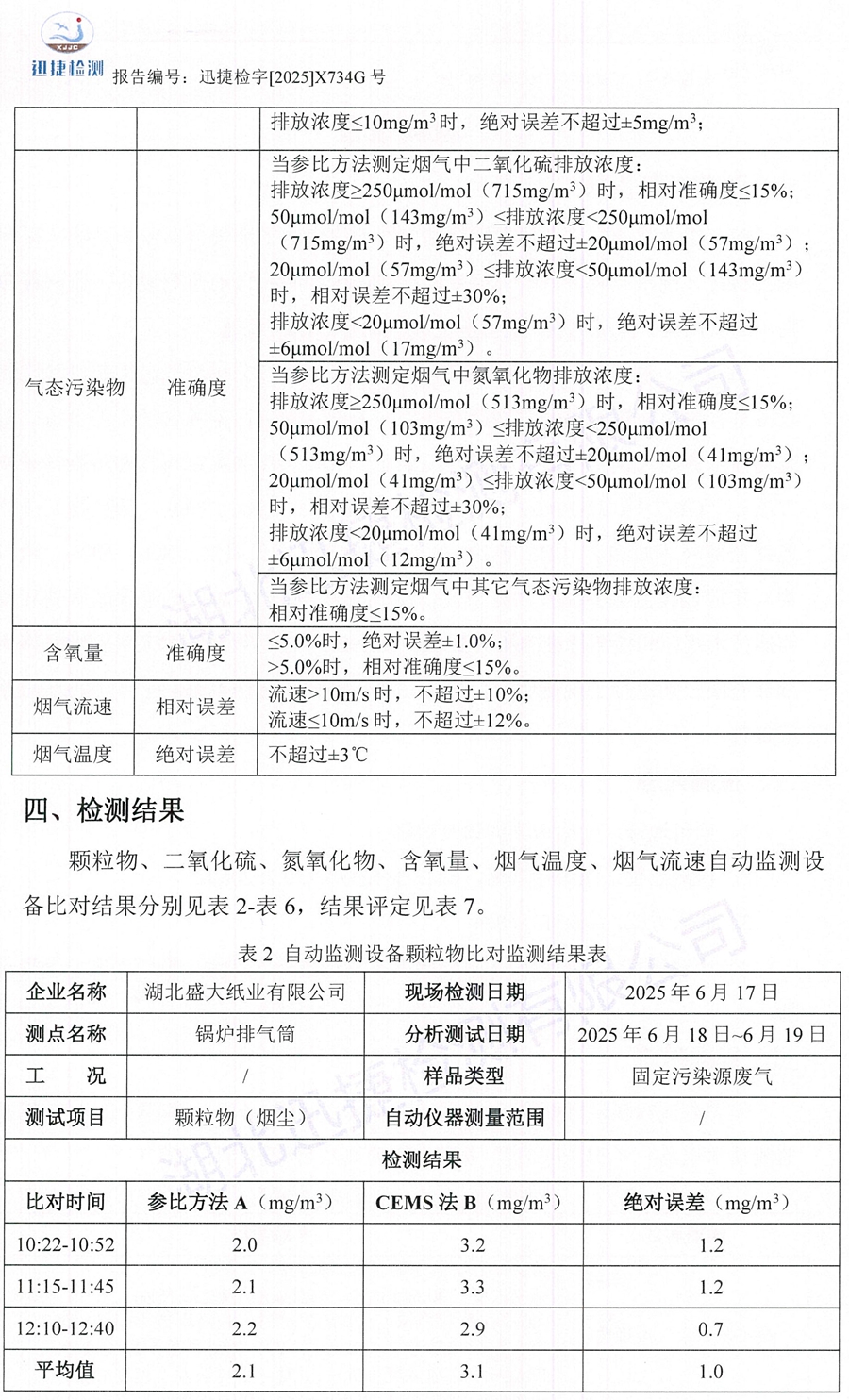 ·您當前的位置是:首頁公司動態X734湖北盛大紙業有限公司2025年6月煙氣自動監測系統比對監測報告[信息公開]