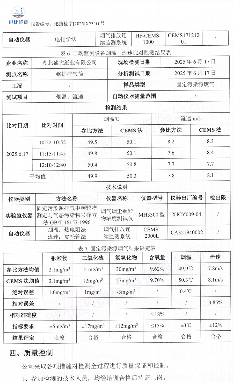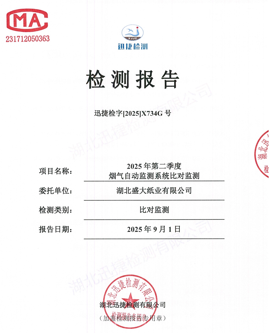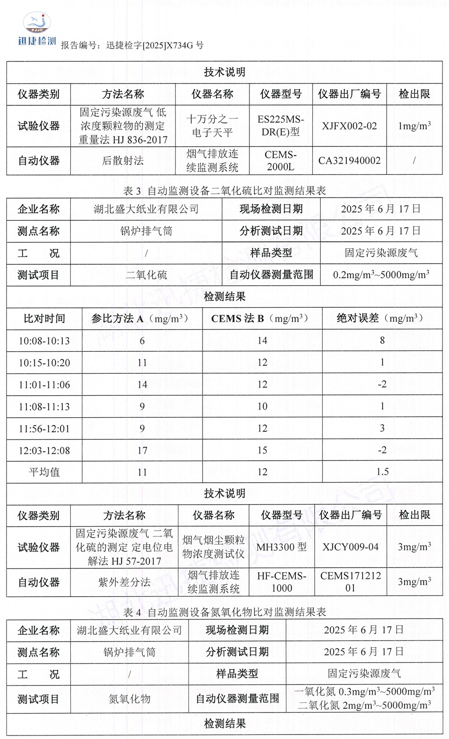 ·您當前的位置是:首頁公司動態X734湖北盛大紙業有限公司2025年6月煙氣自動監測系統比對監測報告[信息公開]